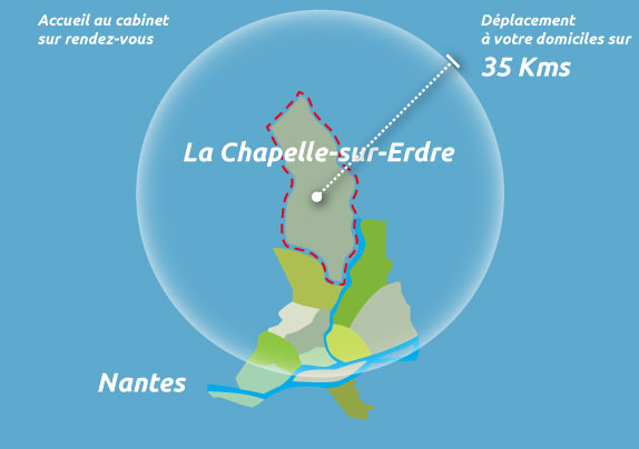 Patricia Mahieux, kinésiologue, intervient dans un rayon de 35 km autour de La Chapelle-sur-Erdre en Loire-Atlantique notamment à Carquefou, Nantes, Vertou, Blain, Nort-sur-Erdre, Rouans, Saint-Herblain, Ancenis, Oudon, Sainte-Luce-sur-Loire et Vallet.
